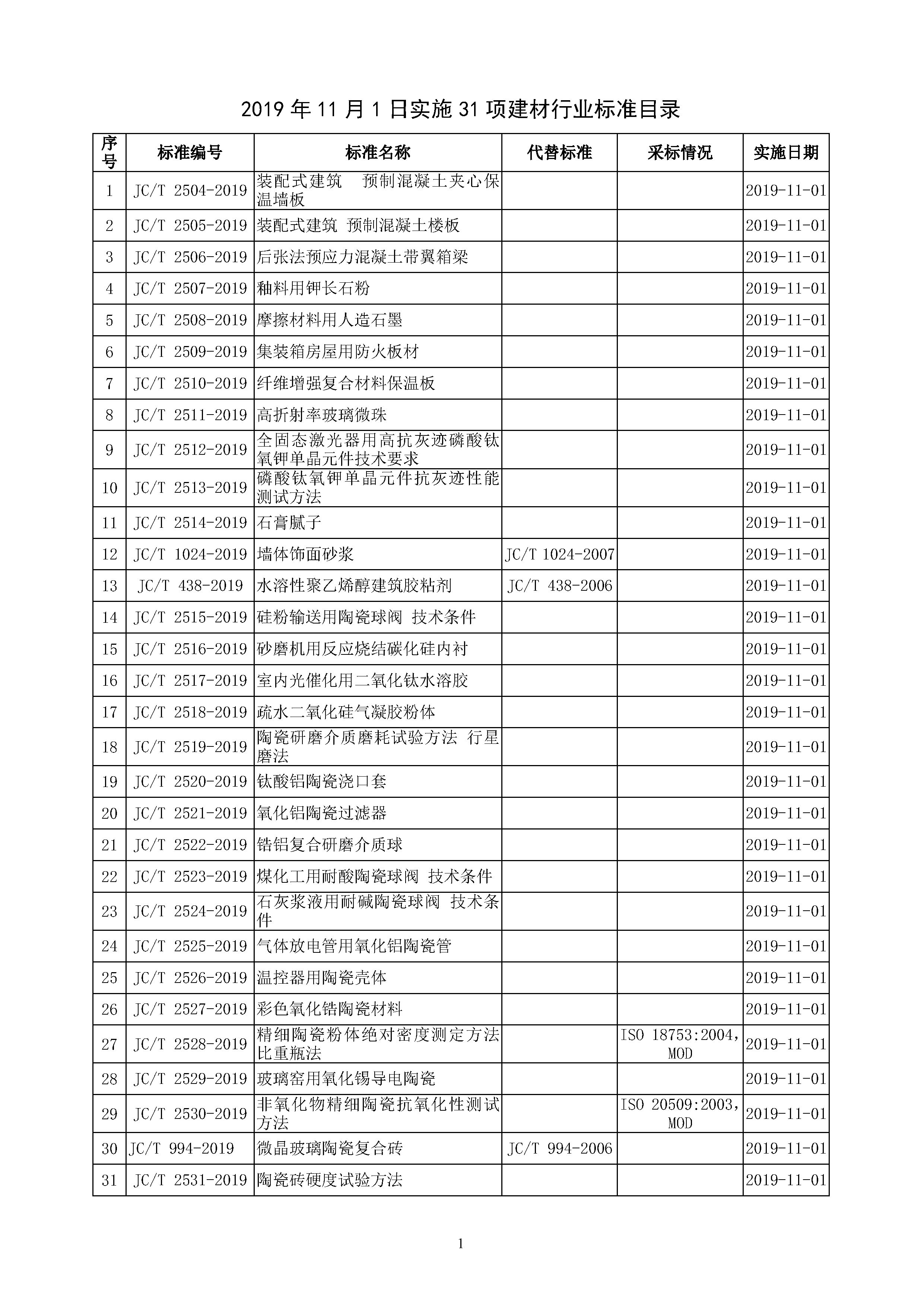 其中31項(xiàng)建材行業(yè)標(biāo)準(zhǔn)將于2019年11月1日正式實(shí)施。
