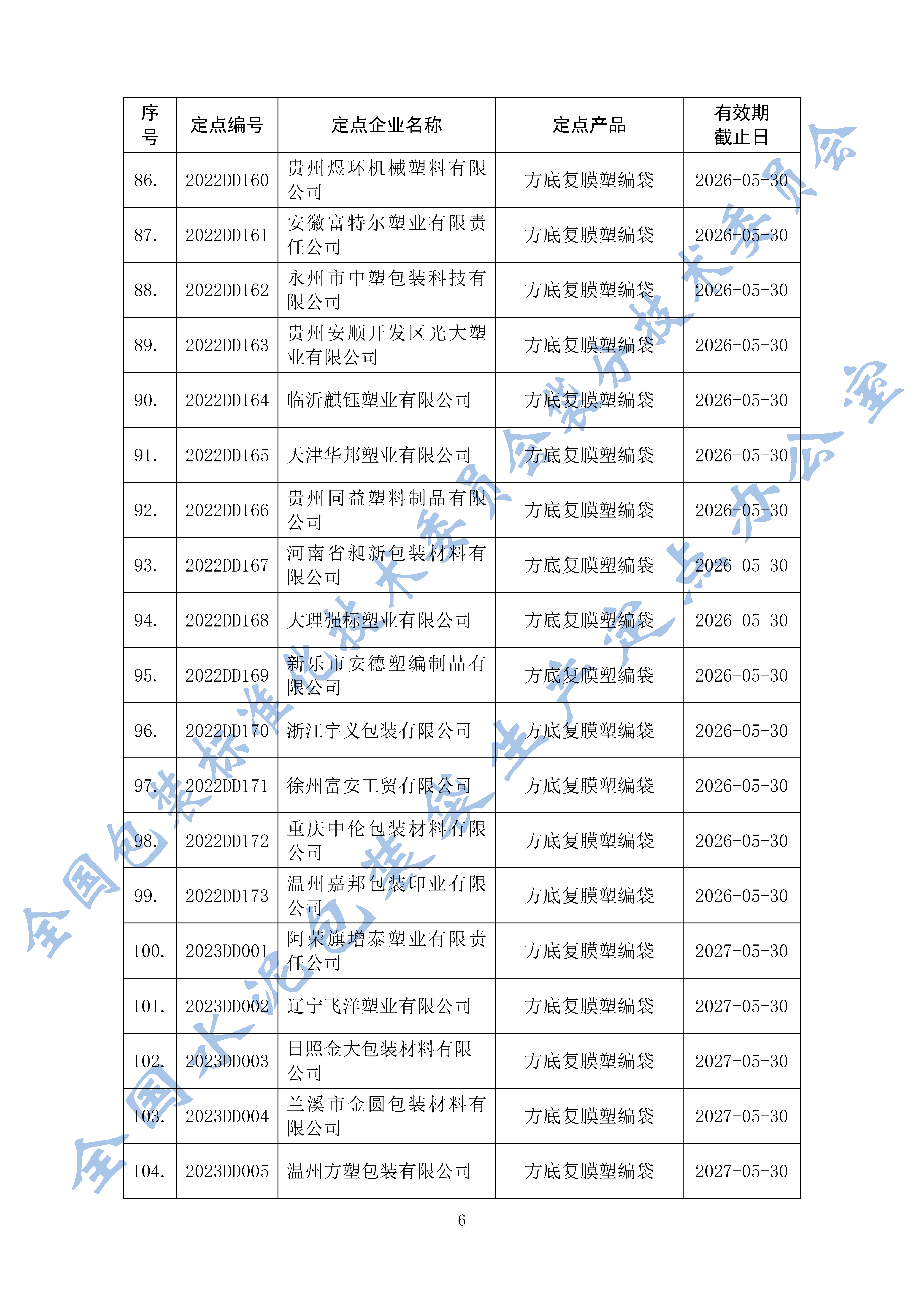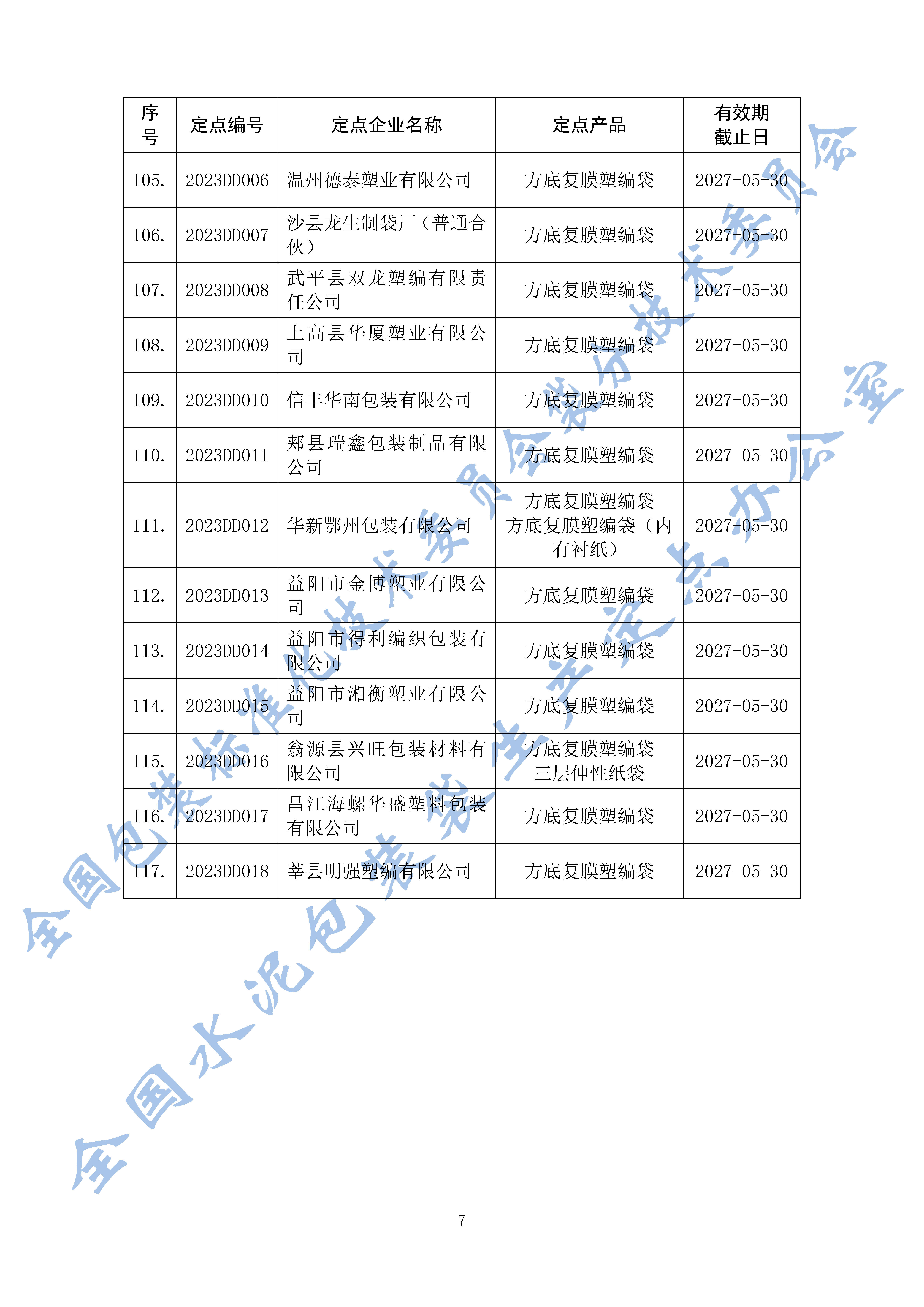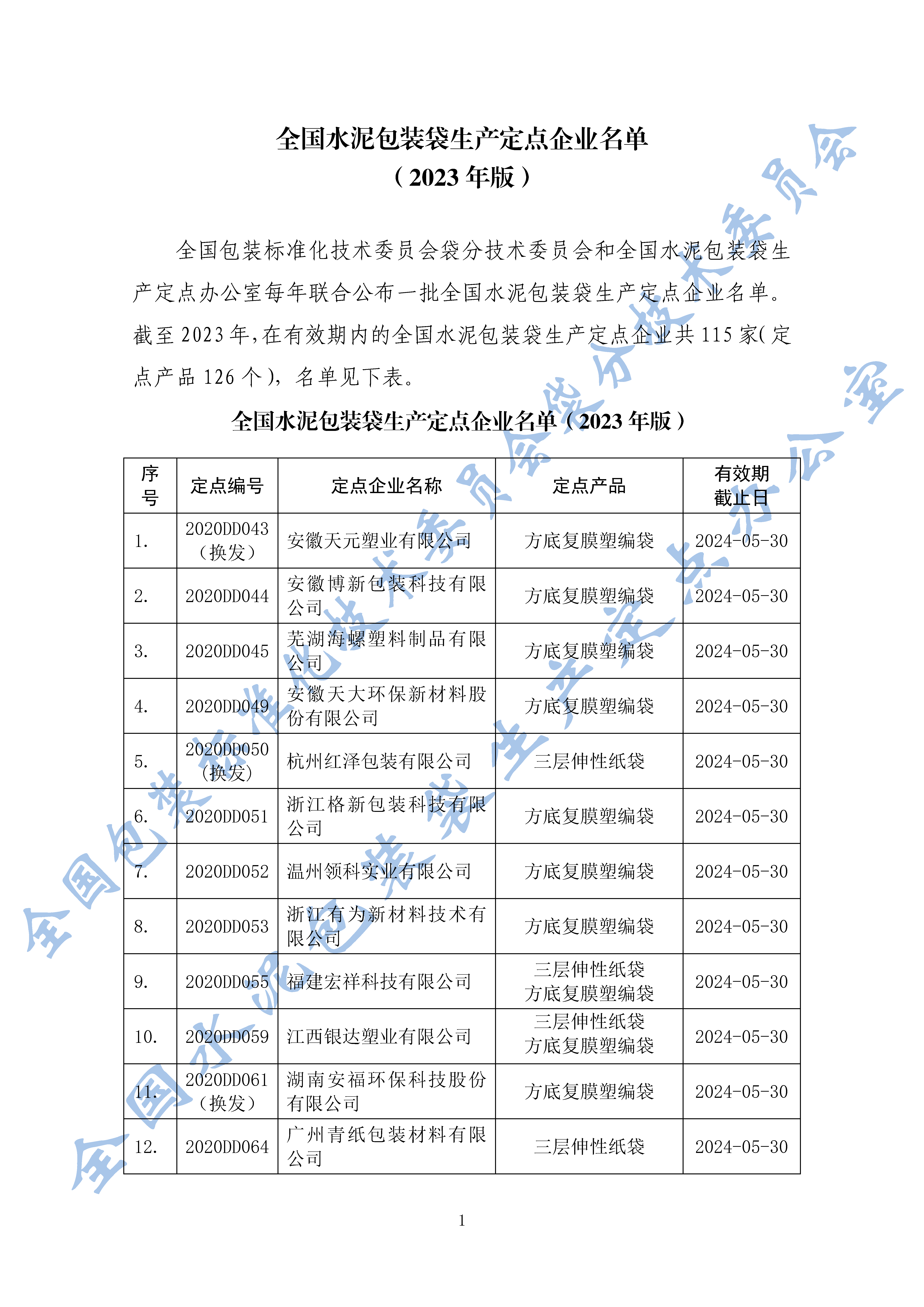 全國包裝標準化技術委員會袋分技術委員會和全國水泥包裝袋生產定點辦公室每年聯(lián)合公布一批全國水泥包裝袋生產定點企業(yè)名單。截至2023年,在有效期內的全國水泥包裝袋生產定點企業(yè)共115家(定點產品126個),名單見下表。