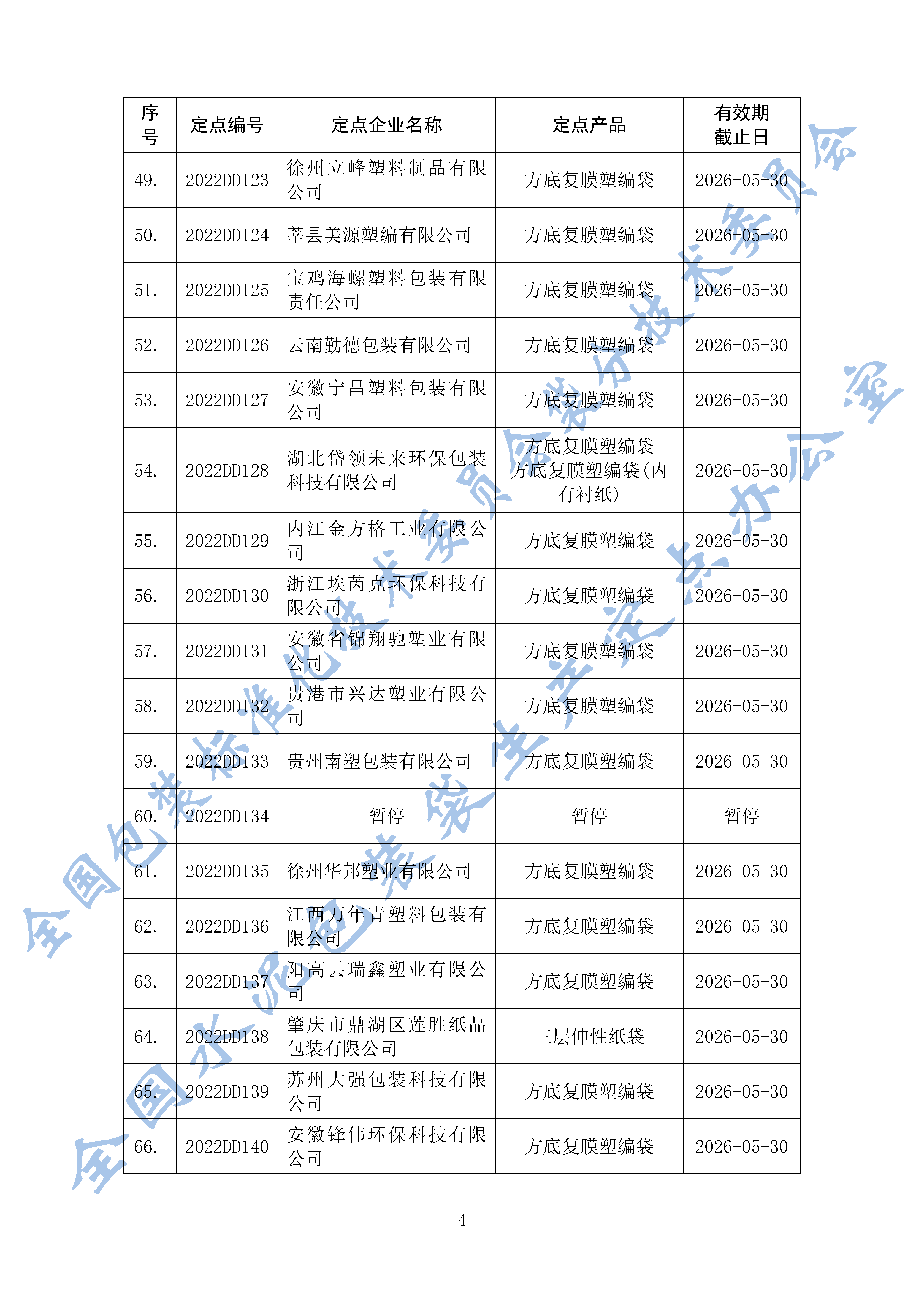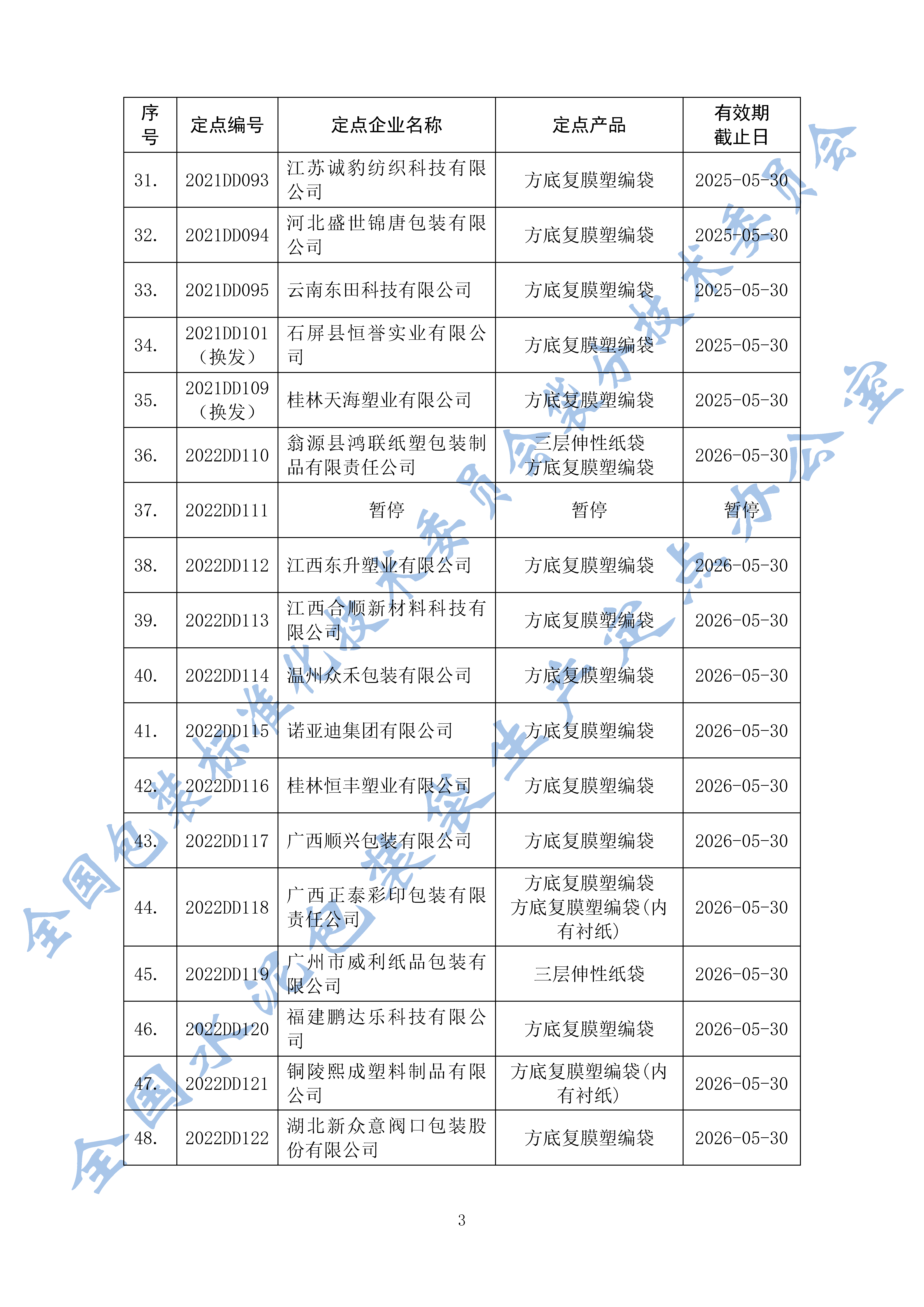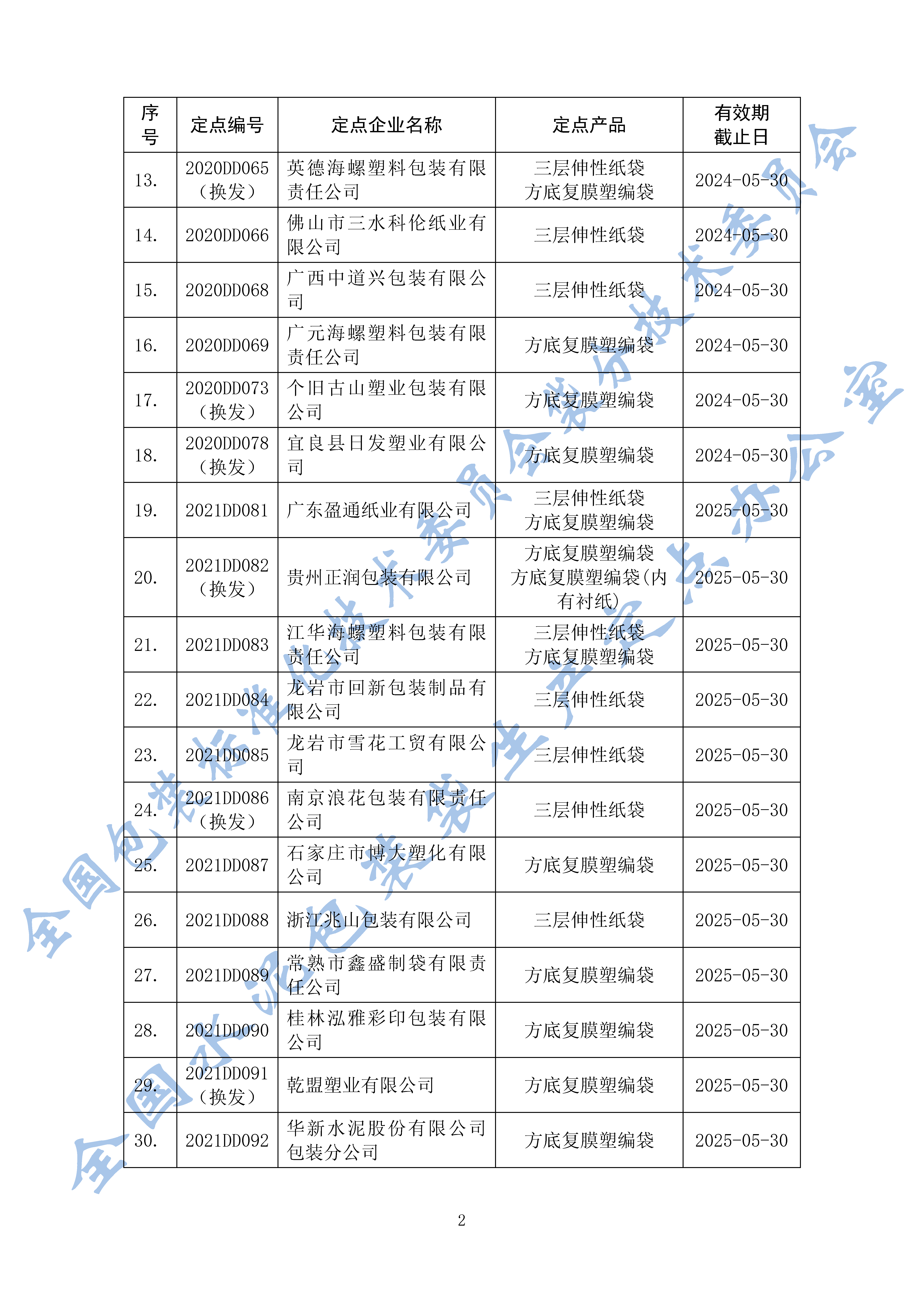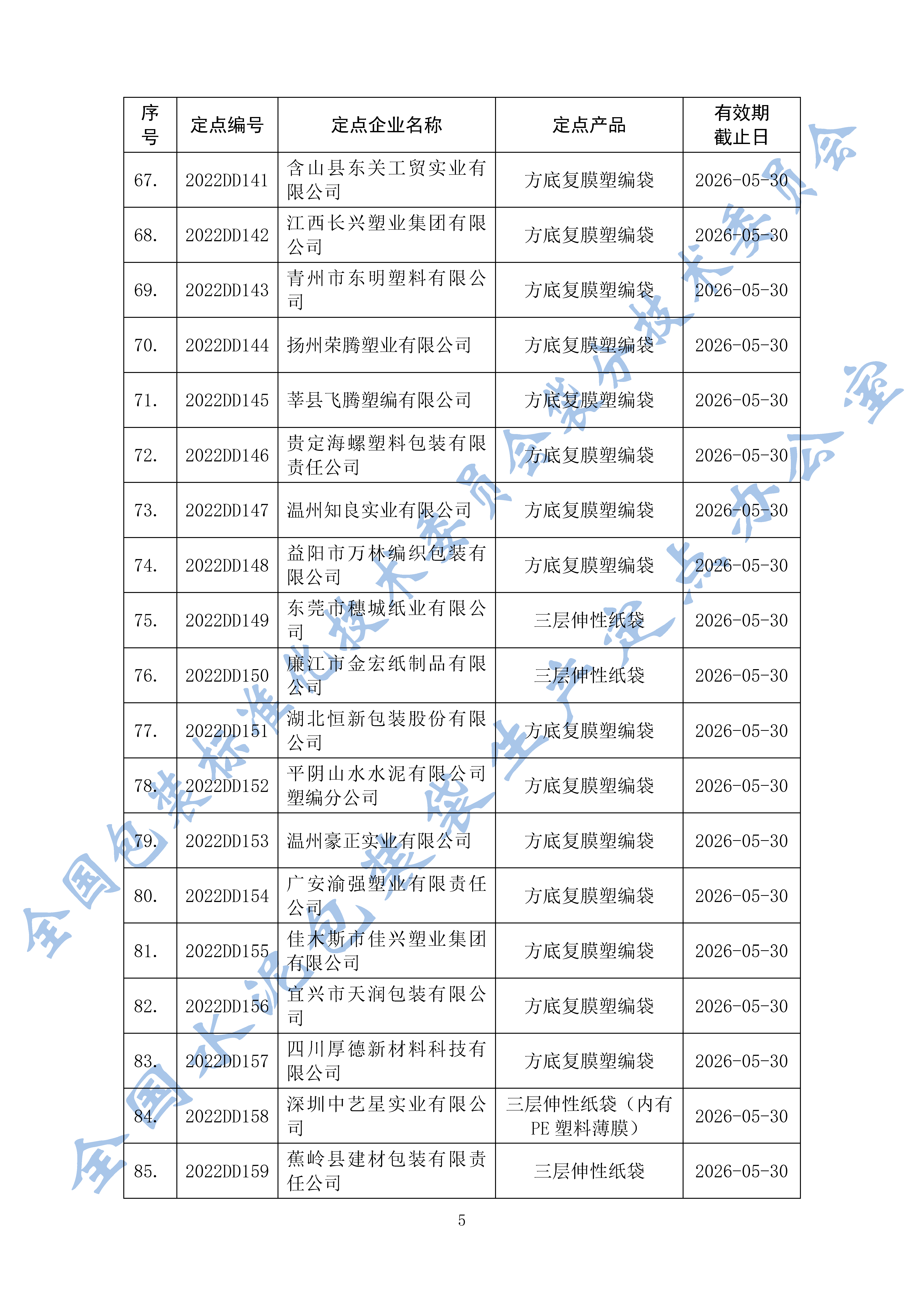 全國包裝標準化技術委員會袋分技術委員會和全國水泥包裝袋生產定點辦公室每年聯(lián)合公布一批全國水泥包裝袋生產定點企業(yè)名單。截至2023年,在有效期內的全國水泥包裝袋生產定點企業(yè)共115家(定點產品126個),名單見下表。
